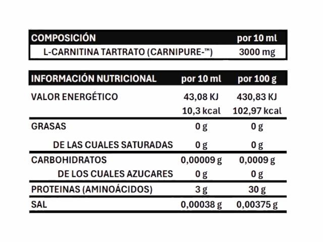 Cada vial (10 ml) contiene 3000 mg de L-Carnitina. Apto para personas celíacas.