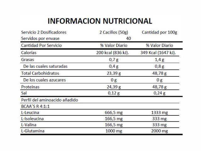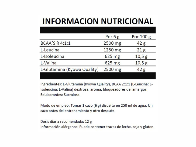 Es una fórmula de BCAA y Glutamina que evitará la degradación muscular durante el entrenamiento. Ratio 2:1:1