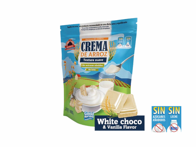 Crema Arroz White Chocolate (Blanco). Gran digestibilidad, SIN Lactosa, con Stevia, SIN Gluten. Fuente de energía. Bajo en grasa.